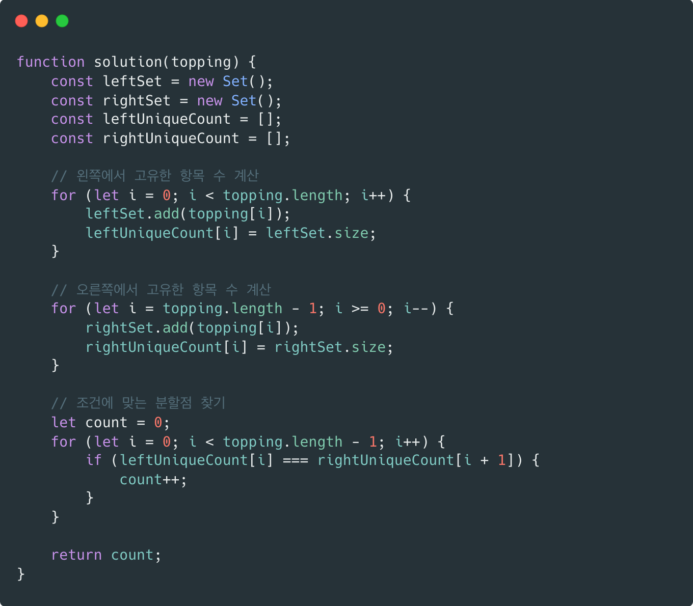rightUniqueCount[i+1]는 오른쪽 시작을 의미하고 오른쪽 시작까지의 집합의 크기를 저장하고 있다.